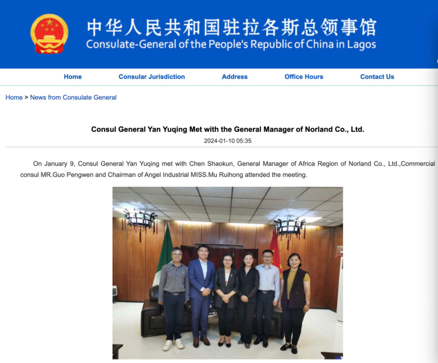 On January 9th, Consul General Yan Yuqing met with Chen Shaokun, General Manager of Norland African Region. Commercial consul Mr.Guo Pengwen and Chairman of Angel Industrial Miss.Mu Ruihong attended the meeting.